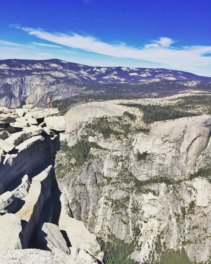 There are poles that the cables run through every few feet and sketchy wooden slats placed across the base of each pair of poles that you can stand at as a break from the slippery granite. It took our crew about twenty five minutes to make it up Half Dome and the panoramic views you are greeted with at the top are unbelievable. We posted up for a quick snack break and then proceeded to find the most scary looking rock projection on Half Dome, aptly named the Devil’s Diving Board.